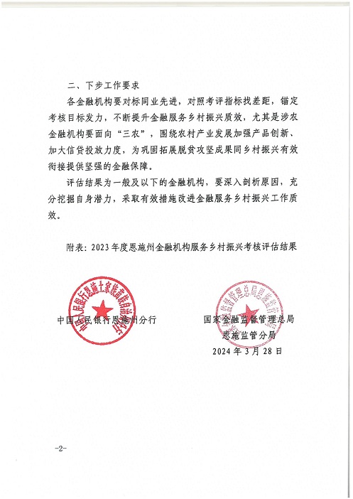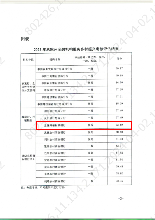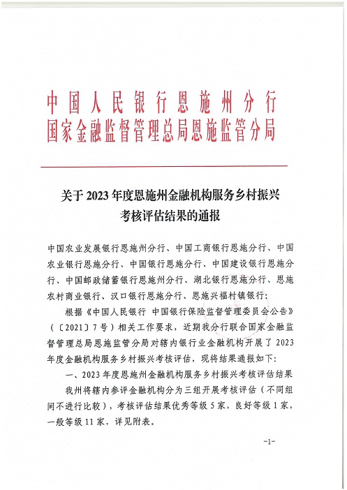 近日,中国人民银行恩施州分行、国家金融监管总局恩施监管分局通报了“2023年度恩施州金融机构服务乡村振兴考核评估”的情况,恩施兴福村镇银行获评服务乡村振兴战略考评“优秀”等次。