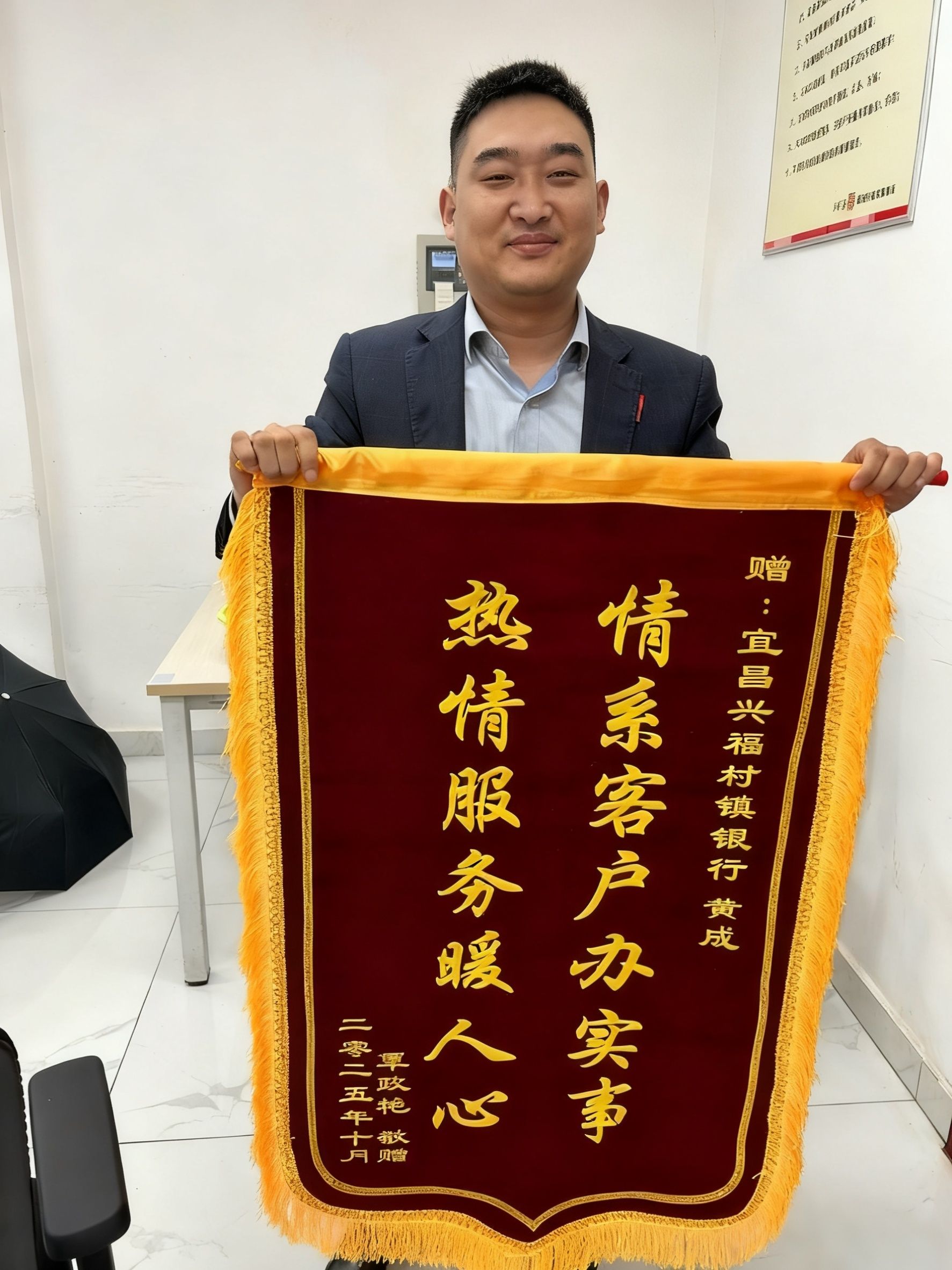 近日,宜昌兴福村镇银行龙泉支行客户经理黄成获得客户覃女士赠予的“情系客户办实事,热情服务暖人心”锦旗,以感谢其在特殊时期的暖心帮扶。