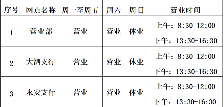 首先感谢您对高港兴福村镇银行一直以来的支持和关爱,为提供更加优质高效的金融服务,提高营业网点服务水平,自2026年01月01日起,我行总行营业部、大泗支行、永安支行网点营业时间作如下调整: