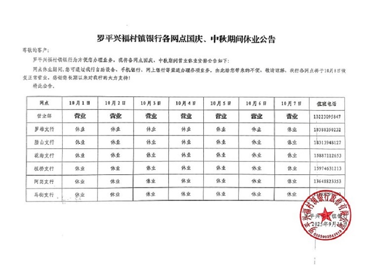 罗平兴福村镇银行各网点国庆、中秋期间休业公告