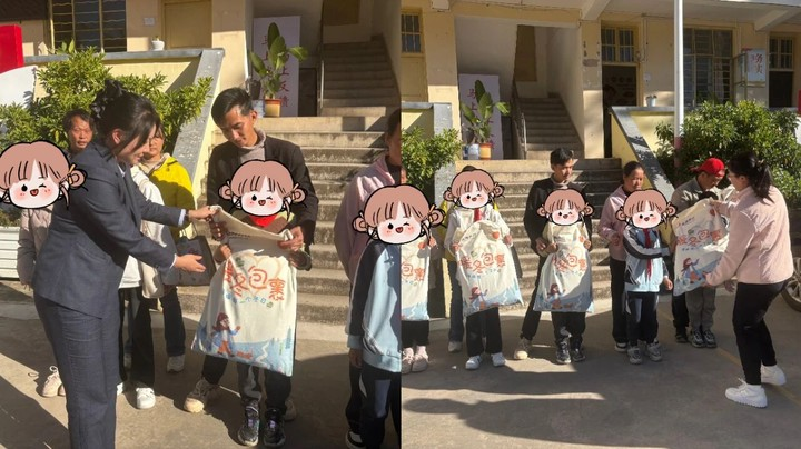 一街乡副乡长赵娴与南华兴福村镇银行五街分理处主任狄美芳共同出席活动,并亲手将暖冬礼包递至学生手中。礼包内含羽绒服、保暖内衣与学习用具,实用贴心,助力学子温暖过冬、安心向学。