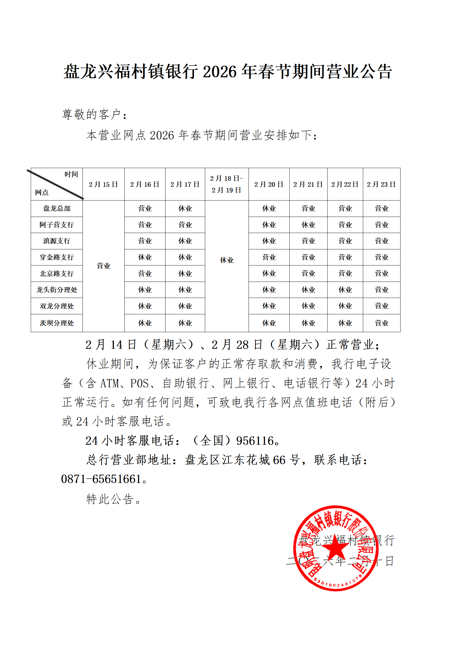盘龙兴福村镇银行2026年春节期间营业公告