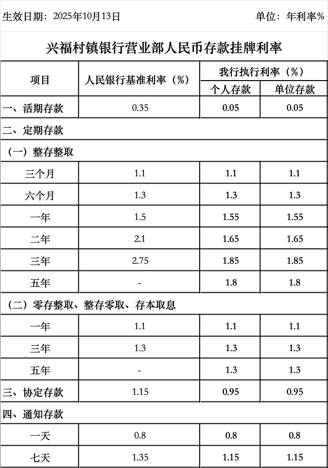 兴福村镇银行营业部人民币存款挂牌利率